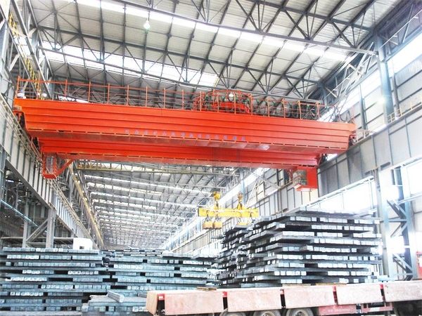 用于搬運(yùn)長件板坯、棒材等黑色金屬?;剞D(zhuǎn)通過兩種形式實(shí)現(xiàn),一種形式為掛梁回轉(zhuǎn),即掛梁為雙層結(jié)構(gòu),上層掛梁通過滑輪組與鋼絲繩纏繞,下層掛梁配有多臺電磁吸盤或夾鉗,可隨驅(qū)動機(jī)構(gòu)回轉(zhuǎn)一定角度。另一種形式為小車回轉(zhuǎn),即小車為雙層結(jié)構(gòu),上層小車布置有起升機(jī)構(gòu),下層小車為運(yùn)行小車,上面鋪設(shè)有環(huán)形軌道,上層小車可沿環(huán)形軌道回轉(zhuǎn)。